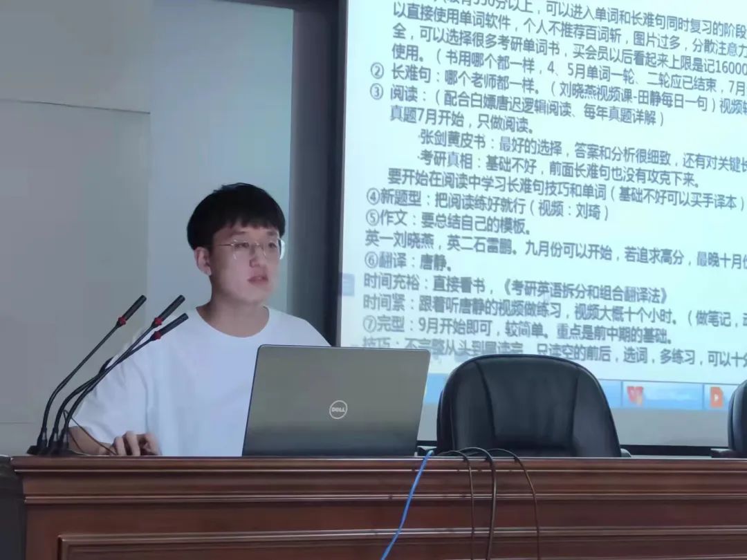 交流会线上线下同步进行,线上分享的为王闯、方佳怡、董司桐、陈艺萱同学,线下分享的为邢瑞芳、刘硕、王梓旖、裴亚玲、张欣杰同学。九位同学结合自身考研经历,分别从院校选择、时间安排、课程学习、心态调整四个方面向同学们提出建议,真诚的态度和实操的干货,使同学们受益匪浅。