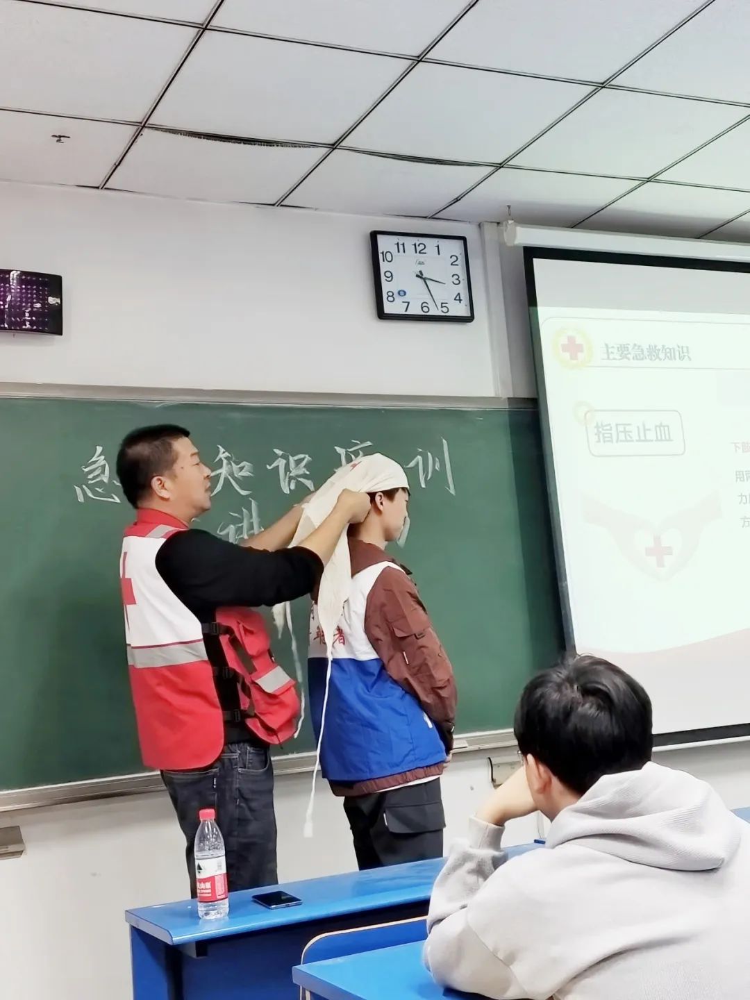 接着,宣讲人员为我们讲解三角巾的常见使用方法,包括头部、胸部、膝盖的三角巾包扎方式,并邀请同学上前体验。