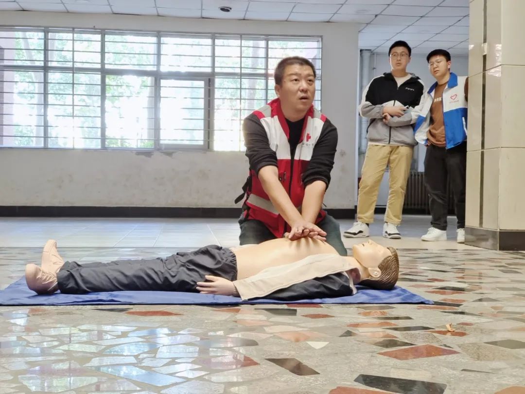 然后,宣讲人员在教室外为我们讲解现场急救与心肺复苏的相关知识及注意事项并邀请同学体验。