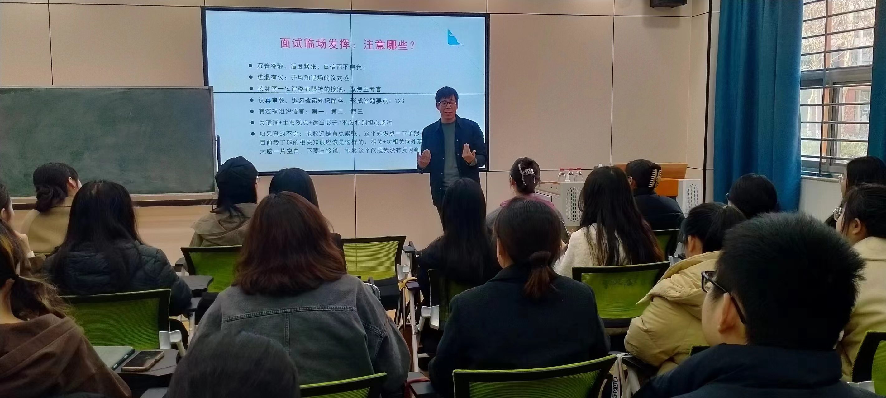 林老师首先对同学们取得的初试成绩表示祝贺,鼓励同学们稳住步伐,打好考研复试信息战、心理战、攻坚战。就同学们关心的复试问题,林老师从为什么要复试、复试是什么、专业知识准备、临场发挥注意事项、面试礼仪及突发状况处理等方面进行了详细讲解,提醒学生们“低头学习、抬头看路”,密切关注招生单位复试信息,有针对性地做好“场景预演式复习”。