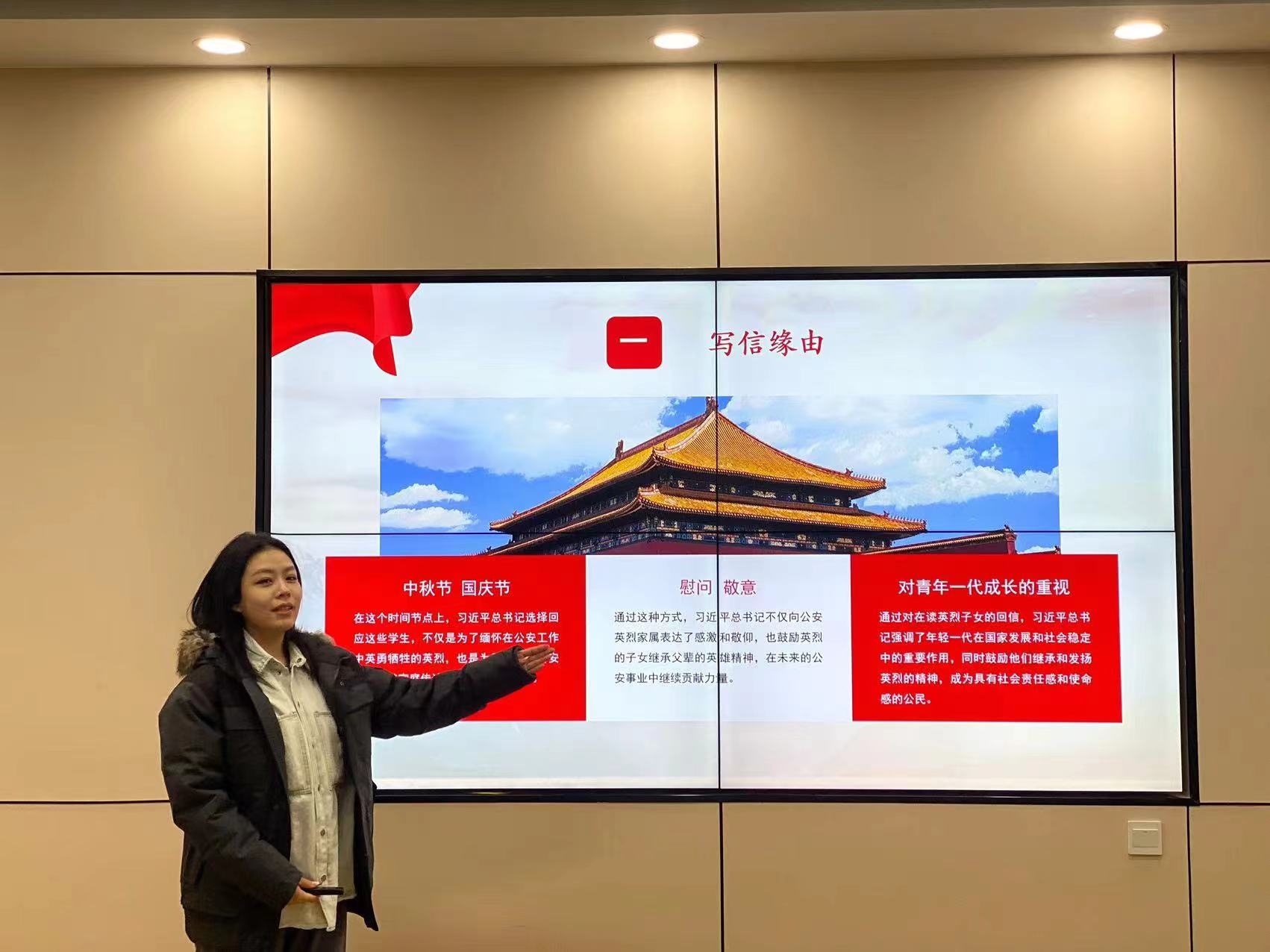 刘宇菲与姜晓雪同学介绍了“习近平总书记给中国人民公安大学在读英烈子女的回信”。总书记的回信充满着对公安英烈家属关心关怀,让广大公安民警士气振奋、斗志昂扬。两位同学从弘扬英雄文化,重视国家与社会安全,人才培养和增强社会凝聚力几个方面对回信精神进行了解读,号召同学们继承英烈遗志 续写英雄荣光。