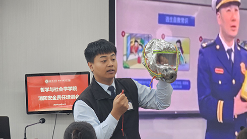 陈洋从校园火灾案例分析入手,为同学们讲解了校园消防责任、宿舍消防隐患、火灾防患知识、扑救初起火灾知识,报警注意事项、及火灾逃生自救知识。在讲解中,陈洋结合自己的消防工作经历,生动讲述了火灾事故现场的残酷,因消防意识淡薄而带来的惨痛教训,他号召同学们时刻注意消防安全,小心谨慎用火、用电,共同建设美好家园。互动环节,陈洋为同学们演示了灭火器的检查、使用方法,介绍了火情判断的基本常识,演示了火灾逃生的动作要领。